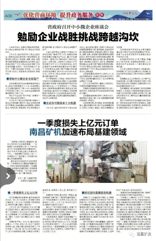 近日,南昌礦山機械有限公司(以下簡稱“南昌礦機”)總裁龔友良接受了江南都市報記者的采訪,并談到面對日益嚴(yán)峻的全球疫情,企業(yè)如何做到積極應(yīng)對,并在當(dāng)前的形勢之下迅速調(diào)整經(jīng)營戰(zhàn)略,搶抓機遇。采訪報道中還提到,龔友良總裁認(rèn)為“疫情只是公司發(fā)展過程中的一個插曲,未來南昌礦機還將從主機生產(chǎn)銷售,邁向系統(tǒng)集成總包及運營、備用備件生產(chǎn)銷售與主機生產(chǎn)為一體的全產(chǎn)業(yè)鏈運營,實現(xiàn)從制造業(yè)向制造服務(wù)業(yè)延伸的蛻變升級” 。
