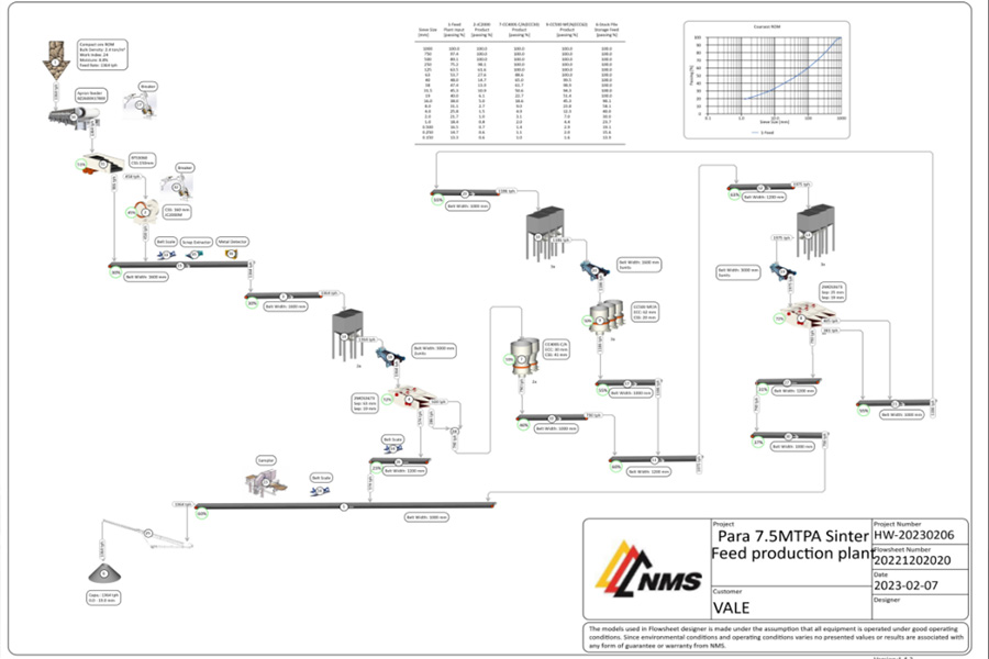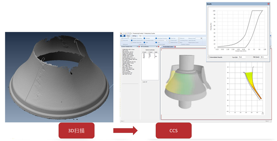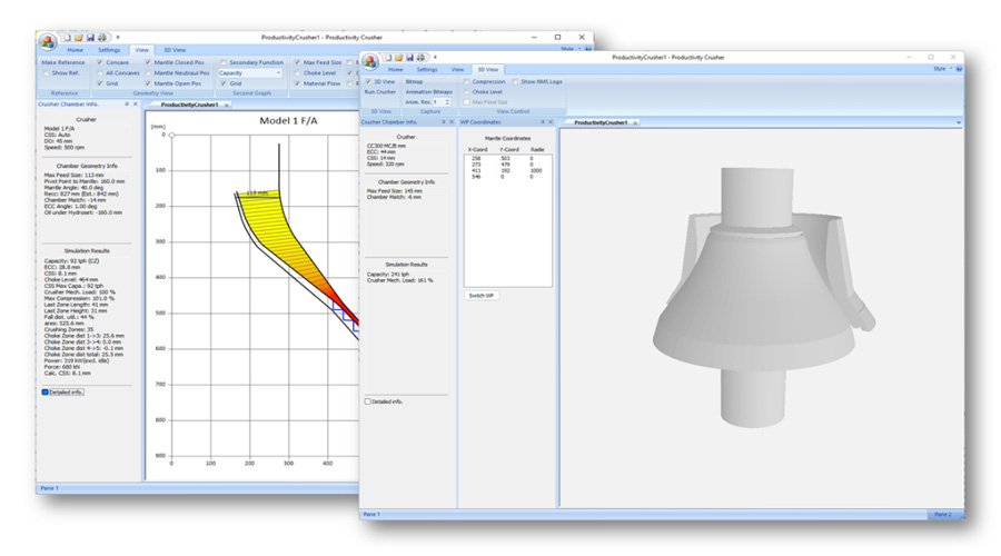 結(jié)合信息化技術(shù)開發(fā)出的一款具有自主知識(shí)產(chǎn)權(quán)的破碎機(jī)設(shè)計(jì)優(yōu)化模擬軟件Cone Crusher Simulator,配合NMS的流程設(shè)計(jì)軟件Flow sheet designer提供設(shè)備生產(chǎn)性能預(yù)測,為前期工藝流程設(shè)計(jì)中的設(shè)備選型提供有效的數(shù)據(jù)支撐,降低工藝設(shè)計(jì)期望與實(shí)際生產(chǎn)效果之間的差異。